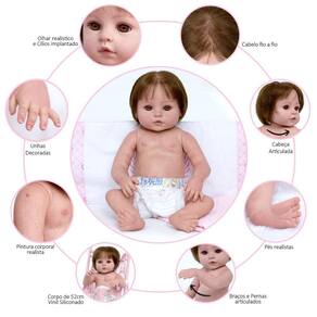 A nossa empresa tem a missão de garantir a total satisfação de seus clientes, onde a qualidade e o atendimento excepcional são nossa prioridade Estamos muito felizes em apresentar a Boneca Bebê Reborn Fio a Fio para você, um item cuidadosamente selecionado para atender às suas necessidades. Compre agora e experimente a diferença em comprar com a nossa loja. A Boneca Bebê Reborn Fio a Fio é o sonho das meninas Produzida 100% em vinil siliconado, essa boneca pode sentar, deitar e fazer tudo que a sua imaginação deixar. Com seus olhos castanhos e pintura realista ela é encantadora e apaixonante. Sua criança merece a melhor qualidade de bebê reborn Marca: Cegonha Reborn Dolls Modelo: Boneca Bebê Reborn Fio a Fio Cor: Bege Material: Vinil Siliconado Atóxico Características Principais: Membros Articulados, Cabelo Implantado Fio a Fio, Corpo de Silicone, Pintura Realista. Medidas Aprox.: Altura da Boneca: 52cm Peso Aprox. Da Boneca: 0,745 Kg Certificado INMETRO Recomendado para crianças maiores de 03 anos Conteúdo: 01 Bebê Reborn Cabelo Fio a Fio Cabeça, Membros e Corpo de Vinil 01 Fralda 30 dias de oferecida pelo fabricante. Dúvidas Frequentes: 1. A boneca acompanha itens R. Apenas uma fralda. 2. Ela emite algum som R. Não, ela não emite nenhum som. 3. Pode dar banho na boneca R. Sim, pois o material do corpo é de Silicone. 4. Pode escolher a cor dos olhos da boneca R. dos olhos. Tags: boneca, bebe, reborn, realista, menina, infantil, silicone, bailarina, princesa, linda, fofa, banho, enxoval, completo, grande, baby alive. Homologação Inmetro: IP-BRI-2749/2021-01