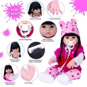 A nossa empresa tem a missão de garantir a total satisfação de seus clientes, onde a qualidade e o atendimento excepcional são nossa prioridade Estamos muito felizes em apresentar a Boneca Bebê Reborn Girafinha para você, um item cuidadosamente selecionado para atender às suas necessidades. Compre agora e experimente a diferença em comprar com a nossa loja.A Boneca Bebê Reborn Girafinha é o sonho das meninas Produzida 100% em vinil siliconado, essa boneca pode sentar, deitar e fazer tudo que a sua imaginação deixar. Com seus olhos castanhos e detalhes realistas ela é encantadora e apaixonante. Sua criança merece a melhor qualidade de bebê reborn Marca: Cegonha Reborn DollsModelo: Boneca Bebê Reborn GirafinhaCor: BegeMaterial: Vinil Siliconado AtóxicoCaracterísticas Principais: Membros Articulados, Corpo de Silicone, Detalhes Realistas.Medidas Aprox.: Altura da Boneca: 52cm Peso Aprox. Da Boneca: 0,745 Kg Certificado INMETRO Recomendado para crianças maiores de 03 anosConteúdo:1 Bebê Reborn Cabeça, Membros e Corpo de Vinil 1 Conjunto de Roupa Girafinha1 Par de Cílios1 Par de Brinco1 Chupeta1 Mamadeira Simples5 Certificados2 Fraldas 1 Par de Sapatinhos1 PelúciaGarantia30 dias de garantia oferecida pelo fabricante.Dúvidas Frequentes:1. Ela acompanha ItensR. Sim, todos os itens da descrição.2. Ela emite algum somR. Não, ela não emite nenhum som.3. Pode dar banho na bonecaR. Sim, pois o material do corpo é de Silicone.4. Pode escolher a cor dos olhos da bonecaR. Não, os olhos já vêm de fábrica.Tags: Boneca, Bebe, Reborn, Realista, Menina, Infantil, Silicone, Bailarina, Princesa, Linda, Morena, Loira, Fofa, Banho, Enxoval, Completo, Grande, Baby Alive.Homologação Inmetro: IP-BRI-2749/2021-01
