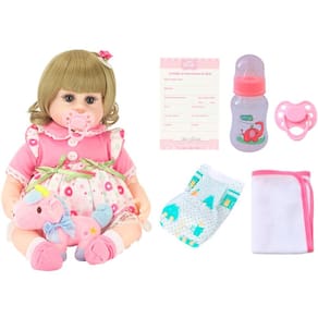 1x Mamadeira; 1x Chupeta; 1x Certidão de Nascimento; 1x Fralda; 1x Roupinha; 1x Ursinho de pelúcia; 1x Par de acessórios para o cabelo; 1x Mantinha.