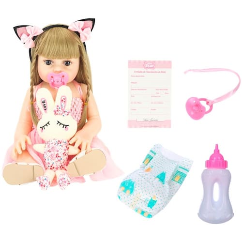 Essa linda boneca realista bebê reborn é o presente perfeito para qualquer criança! Ela tem 48cm de altura, corpo todo revestido em silicone (o que permite banhos), repleto de detalhes marcantes e realistas que vão tornar a brincadeira ainda mais imersiva. Os cabelos da bebê reborn são de fio de nylon suave, macios e de aparência idêntica aos fios humanos, os olhos são de cores vívidas e vão instigar ainda mais a imaginação dos pequenos! A bebê reborn pandinha acompanha mamadeira, chupeta magnética, um conjunto de pijamas e coelho de pelúcia.