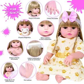 A nossa empresa tem a missão de garantir a total satisfação de seus clientes, onde a qualidade e o atendimento excepcional são nossa prioridade Estamos muito felizes em apresentar a Boneca Bebê Reborn para você, um item cuidadosamente selecionado para atender às suas necessidades. Compre agora e experimente a diferença em comprar com a nossa loja.A Boneca Bebê Reborn é o sonho das meninas Produzida 100% em vinil siliconado, essa boneca pode sentar, deitar e fazer tudo que a sua imaginação deixar. Com seus olhos castanhos e detalhes realistas ela é encantadora e apaixonante. Sua criança merece a melhor qualidade de bebê reborn Marca: Cegonha Reborn DollsModelo: Boneca Bebê RebornCor: BegeMaterial: Vinil Siliconado AtóxicoCaracterísticas Principais: Membros Articulados, Corpo de Silicone, Detalhes Realistas.Medidas Aprox.: Altura da Boneca: 52cm Peso Aprox. Da Boneca: 0,745 Kg Certificado INMETRO Recomendado para crianças maiores de 03 anosConteúdo:1 Bebê Reborn Cabeça, Membros e Corpo de Vinil 1 Vestido 1 Par de Cílios1 Par de Brinco1 Chupeta 1 Mamadeira Simples5 Certificados3 Fraldas1 Laço Cetim2 Presilhinha1 Par de Luvas1 Bolsa Maternidade1 Prendedor de ChupetaKit Pente e Escova SimplesGarantia30 dias de garantia oferecida pelo fabricante.Dúvidas Frequentes:1. Ela acompanha ItensR. Sim, todos os itens da descrição.2. Ela emite algum somR. Não, ela não emite nenhum som.3. Pode dar banho na bonecaR. Sim, pois o material do corpo é de Silicone.4. Pode escolher a cor dos olhos da bonecaR. Não, os olhos já vêm de fábrica.Tags: Boneca, Bebe, Reborn, Realista, Menina, Infantil, Silicone, Princesa, Linda, Morena, Loira, Fofa, Banho, Enxoval, Completo, Grande, Baby Alive.Homologação Inmetro: IP-BRI-0406/2022-07