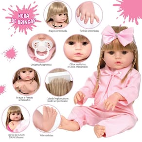A nossa empresa tem a missão de garantir a total satisfação de seus clientes, onde a qualidade e o atendimento excepcional são nossa prioridade Estamos muito felizes em apresentar a Boneca Bebê Reborn para você, um item cuidadosamente selecionado para atender às suas necessidades. Compre agora e experimente a diferença em comprar com a nossa loja.A Boneca Bebê Reborn é o sonho das meninas Produzida 100% em vinil siliconado, essa boneca pode sentar, deitar e fazer tudo que a sua imaginação deixar. Com seus olhos castanhos e detalhes realistas ela é encantadora e apaixonante. Sua criança merece a melhor qualidade de bebê reborn Marca: Cegonha Reborn DollsModelo: Boneca Bebê RebornCor: BegeMaterial: Vinil Siliconado AtóxicoCaracterísticas Principais: Membros Articulados, Corpo de Silicone, Detalhes Realistas.Medidas Aprox.: Altura da Boneca: 52cm Peso Aprox. Da Boneca: 0,745 Kg Certificado INMETRO Recomendado para crianças maiores de 03 anosConteúdo:1 Bebê Reborn Cabeça, Membros e Corpo de Vinil 1 Conjunto Pagão Rosa com Roupa Saida de Banho1 Par de Cílios1 Par de Brinco1 Chupeta 1 Mamadeira Simples5 Certificados3 Fraldas1 Laço Cetim2 Presilhinha1 Par de Luvas1 Bolsa Maternidade1 Prendedor de ChupetaKit Pente e Escova SimplesGarantia30 dias de garantia oferecida pelo fabricante.Dúvidas Frequentes:1. Ela acompanha ItensR. Sim, todos os itens da descrição.2. Ela emite algum somR. Não, ela não emite nenhum som.3. Pode dar banho na bonecaR. Sim, pois o material do corpo é de Silicone.4. Pode escolher a cor dos olhos da bonecaR. Não, os olhos já vêm de fábrica.Tags: Boneca, Bebe, Reborn, Realista, Menina, Infantil, Silicone, Princesa, Linda, Morena, Loira, Fofa, Banho, Enxoval, Completo, Grande, Baby Alive.Homologação Inmetro: 08845-01/2021