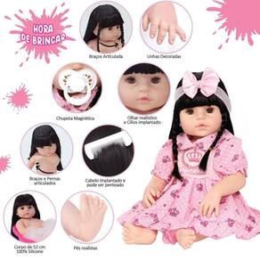 A nossa empresa tem a missão de garantir a total satisfação de seus clientes, onde a qualidade e o atendimento excepcional são nossa prioridade Estamos muito felizes em apresentar a Boneca Bebê Reborn para você, um item cuidadosamente selecionado para atender às suas necessidades. Compre agora e experimente a diferença em comprar com a nossa loja.A Boneca Bebê Reborn é o sonho das meninas Produzida 100% em vinil siliconado, essa boneca pode sentar, deitar e fazer tudo que a sua imaginação deixar. Com seus olhos castanhos e detalhes realistas ela é encantadora e apaixonante. Sua criança merece a melhor qualidade de bebê reborn Marca: Cegonha Reborn DollsModelo: Boneca Bebê Reborn Cor: BegeMaterial: Vinil Siliconado AtóxicoCaracterísticas Principais: Membros Articulados, Corpo de Silicone, Detalhes Realistas.Medidas Aprox.: Altura da Boneca: 52cm Peso Aprox. Da Boneca: 0,745 Kg Certificado INMETRO Recomendado para crianças maiores de 03 anosConteúdo:1 Bebê Reborn Cabeça, Membros e Corpo de Vinil 1 Vestido1 Par de Cílios1 Par de Brinco1 Chupeta 1 Mamadeira Simples5 Certificados3 Fraldas1 Laço Cetim2 Presilhinha1 Par de Luvas1 Bolsa Maternidade1 Prendedor de ChupetaKit Pente e Escova SimplesGarantia30 dias de garantia oferecida pelo fabricante.Dúvidas Frequentes:1. Ela acompanha ItensR. Sim, todos os itens da descrição.2. Ela emite algum somR. Não, ela não emite nenhum som.3. Pode dar banho na bonecaR. Sim, pois o material do corpo é de Silicone.4. Pode escolher a cor dos olhos da bonecaR. Não, os olhos já vêm de fábrica.Tags: Boneca, Bebe, Reborn, Realista, Menina, Infantil, Silicone, Princesa, Linda, Morena, Loira, Fofa, Banho, Enxoval, Completo, Grande, Baby Alive.Homologação Inmetro: CE-BRI-IDEAL 0083-21-2