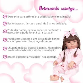 A nossa empresa tem a missão de garantir a total satisfação de seus clientes, onde a qualidade e o atendimento excepcional são nossa prioridade Estamos muito felizes em apresentar a Boneca Bebê Reborn para você, um item cuidadosamente selecionado para atender às suas necessidades. Compre agora e experimente a diferença em comprar com a nossa empresa.A Boneca Bebê Reborn é o sonho das meninas Produzida 100% em vinil siliconado, essa boneca pode sentar, deitar e fazer tudo que a sua imaginação deixar. Com seus olhos castanhos e cabelos implantados ela é encantadora e apaixonante. Sua criança merece a melhor qualidade de bebê rebornMarca: Cegonha Reborn DollsModelo: Boneca Bebê RebornCor: BegeMaterial: Vinil Siliconado AtóxicoCaracterísticas principais: Membros Articulados, Corpo de Silicone, Detalhes Realistas.Medidas Aprox.: Altura da Boneca: 52cmPeso Aprox. Da Boneca: 0,745 KgCertificado INMETRORecomendado para crianças maiores de 03 anosConteúdo:01 Bebê Reborn Cabeça, Membros e Corpo de Vinil 01 Conjunto Pagão Rosa com Roupa Saida de Banho01 Mamadeira01 Escova de Cabelo 01 Pente01 Chupeta Magnética01 Certidão de Nascimento01 Manual de Cuidados01 Certidão de Vacinas01 Exame do Pézinho01 Prendedor de Chupeta01 Kit com 2 Fraldas01 Laço de CetimGarantia30 dias de garantia oferecida pelo fabricante.Dúvidas Frequentes:1. O Cabelo é implantado mesmo ou perucaR. O cabelo da boneca Bailarina é totalmente implantado.2. Ela emite algum somR. Não, ela não emite nenhum som.3. Pode dar banho na bonecaR. Sim, pois o material do corpo é de Silicone.4. O cabelo pode ser penteadoR. Sim, o cabelo da boneca pode ser suavemente escovado e penteado.Tags: boneca, bebe, reborn, realista, menina, infantil, silicone, bailarina, susi, princesa, linda, fofa, banho, enxoval, completo, presente, grande, baby alive, preta.Homologação Inmetro: CE-BRI-IDEAL 0083-21-2