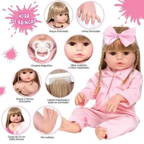 A nossa empresa tem a missão de garantir a total satisfação de seus clientes, onde a qualidade e o atendimento excepcional são nossa prioridade Estamos muito felizes em apresentar a Boneca Bebê Reborn para você, um item cuidadosamente selecionado para atender às suas necessidades. Compre agora e experimente a diferença em comprar com a nossa loja.A Boneca Bebê Reborn é o sonho das meninas Produzida 100% em vinil siliconado, essa boneca pode sentar, deitar e fazer tudo que a sua imaginação deixar. Com seus olhos castanhos e detalhes realistas ela é encantadora e apaixonante. Sua criança merece a melhor qualidade de bebê reborn Marca: Cegonha Reborn DollsModelo: Boneca Bebê RebornCor: BegeMaterial: Vinil Siliconado AtóxicoCaracterísticas Principais: Membros Articulados, Corpo de Silicone, Detalhes Realistas.Medidas Aprox.: Altura da Boneca: 52cm Peso Aprox. Da Boneca: 0,745 Kg Certificado INMETRO Recomendado para crianças maiores de 03 anosConteúdo:1 Bebê Reborn Cabeça, Membros e Corpo de Vinil 1 Conjunto Pagão Rosa com Roupa Saida de Banho1 Par de Cílios1 Par de Brinco1 Chupeta 1 Mamadeira Simples5 Certificados2 Fraldas1 Laço CetimGarantia30 dias de garantia oferecida pelo fabricante.Dúvidas Frequentes:1. Ela acompanha ItensR. Sim, todos os itens da descrição.2. Ela emite algum somR. Não, ela não emite nenhum som.3. Pode dar banho na bonecaR. Sim, pois o material do corpo é de Silicone.4. Pode escolher a cor dos olhos da bonecaR. Não, os olhos já vêm de fábrica.Tags: Boneca, Bebe, Reborn, Realista, Menina, Infantil, Silicone, Princesa, Linda, Morena, Loira, Fofa, Banho, Enxoval, Completo, Grande, Baby Alive.-06Homologação Inmetro: IP-BRI-8778/2018-06