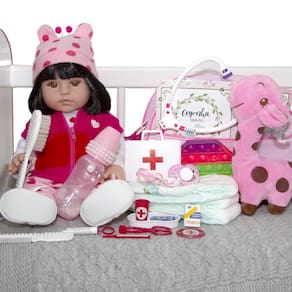 A boneca reborn girafinha é perfeita para encantar qualquer criança, além de ser uma boneca sofisticada com alto padrão de qualidade, a boneca girafinha é também utilizada para reborn, pois é um produto que se aproxima da realidade e traz desde sua fabricação toda delicadeza necessaria. A boneca estimula a interação entre pais e filhos, coordenação manual, estimula a criatividade e imaginação da criança, para deixar a brincadeira ainda mais divertida, além de delicada possui um delicioso cheirinho de bebe perfumada.Características:- 01 bebê reborn- 01 conjunto de roupa de girafinha- 01 mamadeira- 01 chupeta magnética- 01 kit pente e escova- 01 girafa de pelúcia- 03 fraldas- 01 sapatinho variado com disponibilidade do estoque - 01 predendo de chupeta- 01 presilha de cabelo- 01 manual de cuidados- 01 certidão nascimento- 01 certidão de vacinação- 01 exame do pezinhoMedidas aprox.: - boneca: 52cm de altura.Peso aprox.: - 1,707gMaterial: - silicone.Fabricante: - cegonha reborn dolls- certificado inmetro CE-BRI/IQB-167- recomendado para crianças maiores de 03 anos