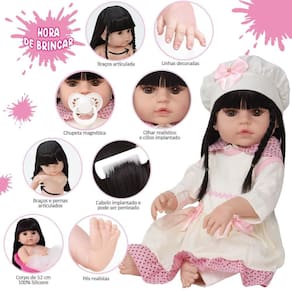 A Boneca Bebê Reborn é o sonho das meninas Produzida 100% em vinil siliconado, essa boneca pode sentar, deitar e fazer tudo que a sua imaginação deixar. Com seus olhos castanhos e detalhes realistas ela é encantadora e apaixonante. Sua criança merece a melhor qualidade de bebê reborn