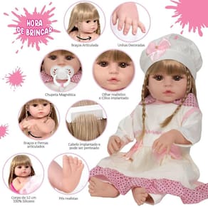 A nossa empresa tem a missão de garantir a total satisfação de seus clientes, onde a qualidade e o atendimento excepcional são nossa prioridade Estamos muito felizes em apresentar a Boneca Bebê Reborn para você, um item cuidadosamente selecionado para atender às suas necessidades. Compre agora e experimente a diferença em comprar com a nossa loja.A Boneca Bebê Reborn é o sonho das meninas Produzida 100% em vinil siliconado, essa boneca pode sentar, deitar e fazer tudo que a sua imaginação deixar. Com seus olhos castanhos e detalhes realistas ela é encantadora e apaixonante. Sua criança merece a melhor qualidade de bebê reborn Marca: Cegonha Reborn DollsModelo: Boneca Bebê Reborn Cor: BegeMaterial: Vinil Siliconado AtóxicoCaracterísticas Principais: Membros Articulados, Corpo de Silicone, Detalhes Realistas.Medidas Aprox.: Altura da Boneca: 52cm Peso Aprox. Da Boneca: 0,745 Kg Certificado INMETRO Recomendado para crianças maiores de 03 anosConteúdo:1 Bebê Reborn Cabeça, Membros e Corpo de Vinil 1 Conjunto de Roupa Luxo1 Par de Cílios1 Par de Brinco1 Chupeta com Artesanato1 Mamadeira Luxo5 Certificados3 Fraldas1 Laço Cetim2 Presilhinha1 Par de Luvas1 Bolsa Maternidade1 Prendedor de ChupetaKit Pente e Escova com Artesanato1 Kit medico1 Sapatinho c Laço1 Kit Panelinha 1 UrsinhoGarantia30 dias de garantia oferecida pelo fabricante.Dúvidas Frequentes:1. Ela acompanha ItensR. Sim, todos os itens da descrição.2. Ela emite algum somR. Não, ela não emite nenhum som.3. Pode dar banho na bonecaR. Sim, pois o material do corpo é de Silicone.4. Pode escolher a cor dos olhos da bonecaR. Não, os olhos já vêm de fábrica.Tags: Boneca, Bebe, Reborn, Realista, Menina, Infantil, Silicone, Princesa, Linda, Morena, Loira, Fofa, Banho, Enxoval, Completo, Grande, Baby Alive.Homologação Inmetro: IP-BRI-0261/2022-05
