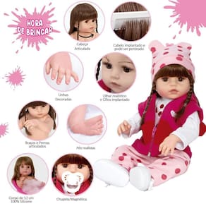 A nossa empresa tem a missão de garantir a total satisfação de seus clientes, onde a qualidade e o atendimento excepcional são nossa prioridade Estamos muito felizes em apresentar a Boneca Bebê Reborn Girafinha para você, um item cuidadosamente selecionado para atender às suas necessidades. Compre agora e experimente a diferença em comprar com a nossa loja.A Boneca Bebê Reborn Girafinha é o sonho das meninas Produzida 100% em vinil siliconado, essa boneca pode sentar, deitar e fazer tudo que a sua imaginação deixar. Com seus olhos castanhos e detalhes realistas ela é encantadora e apaixonante. Sua criança merece a melhor qualidade de bebê reborn Marca: Cegonha Reborn DollsModelo: Boneca Bebê Reborn GirafinhaCor: BegeMaterial: Vinil Siliconado AtóxicoCaracterísticas Principais: Membros Articulados, Corpo de Silicone, Detalhes Realistas.Medidas Aprox.: Altura da Boneca: 52cm Peso Aprox. Da Boneca: 0,745 Kg Certificado INMETRO Recomendado para crianças maiores de 03 anosConteúdo:1 Bebê Reborn Cabeça, Membros e Corpo de Vinil 1 Conjunto de Roupa Girafinha1 Par de Cílios1 Par de Brinco1 Chupeta1 Mamadeira Simples5 Certificados2 Fraldas1 Laço Cetim1 Par de Sapatinhos1 PelúciaGarantia30 dias de garantia oferecida pelo fabricante.Dúvidas Frequentes:1. Ela acompanha ItensR. Sim, todos os itens da descrição.2. Ela emite algum somR. Não, ela não emite nenhum som.3. Pode dar banho na bonecaR. Sim, pois o material do corpo é de Silicone.4. Pode escolher a cor dos olhos da bonecaR. Não, os olhos já vêm de fábrica.Tags: Boneca, Bebe, Reborn, Realista, Menina, Infantil, Silicone, Bailarina, Princesa, Linda, Fofa, Banho, Enxoval, Completo, Grande, Baby Alive.Homologação Inmetro: CE-BRI-IDEAL 0083-21-2