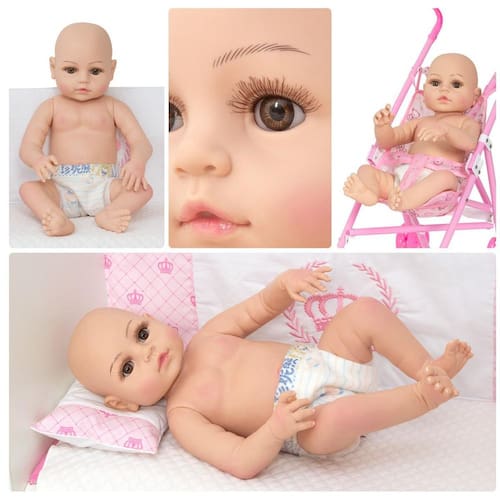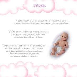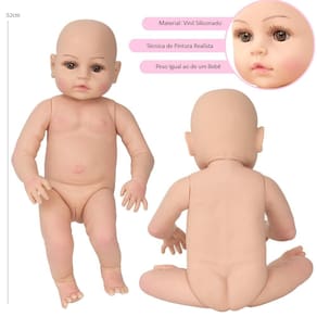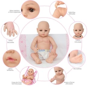 A nossa empresa tem a missão de garantir a total satisfação de seus clientes, onde a qualidade e o atendimento excepcional são nossa prioridade Estamos muito felizes em apresentar a Boneca Bebê Reborn para você, um item cuidadosamente selecionado para atender às suas necessidades. Compre agora e experimente a diferença em comprar com a nossa loja. A Boneca Bebê Reborn é o sonho das meninas Produzida 100% em vinil siliconado, essa boneca pode sentar, deitar e fazer tudo que a sua imaginação deixar. Com seus olhos castanhos e detalhes realistas ela é encantadora e apaixonante. Sua criança merece a melhor qualidade de bebê reborn Marca: Cegonha Reborn Dolls Modelo: Boneca Bebê Reborn Cor: Bege Material: Vinil Siliconado Atóxico Características Principais: Membros Articulados, Corpo de Silicone, Detalhes Realistas. Medidas Aprox.: Altura da Boneca: 52cm Peso Aprox. Da Boneca: 0,745 Kg Certificado INMETRO Recomendado para crianças maiores de 03 anos Conteúdo: 1 Bebê Reborn Cabeça, Membros e Corpo de Vinil 1 Fralda 30 dias de oferecida pelo fabricante. Dúvidas Frequentes: 1. Ela acompanha Itens R. Apenas 1 fralda. 2. Ela emite algum som R. Não, ela não emite nenhum som. 3. Pode dar banho na boneca R. Sim, pois o material do corpo é de Silicone. 4. Pode escolher a cor dos olhos da boneca R. dos olhos. Tags: boneca, bebe, reborn, realista, menina, infantil, silicone, bailarina, princesa, linda, fofa, banho, enxoval, completo, grande, baby alive. Homologação Inmetro: IP-BRI-2749/2021-01