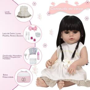 A Boneca Bebê Reborn é o sonho das crianças Produzida 100% em vinil siliconado, essa boneca pode sentar, deitar e fazer tudo que a sua imaginação deixar. Com seus olhos castanhos e detalhes realistas ela é encantadora e apaixonante. Sua criança merece a melhor qualidade de bebê reborn
