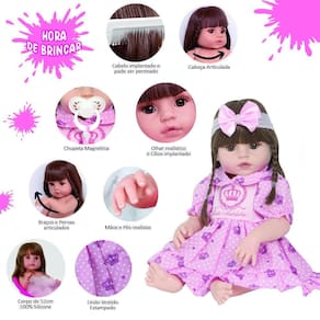 A Boneca Bebê Reborn é o sonho das meninas Produzida 100% em vinil siliconado, essa boneca pode sentar, deitar e fazer tudo que a sua imaginação deixar. Com seus olhos castanhos e detalhes realistas ela é encantadora e apaixonante. Sua criança merece a melhor qualidade de bebê reborn