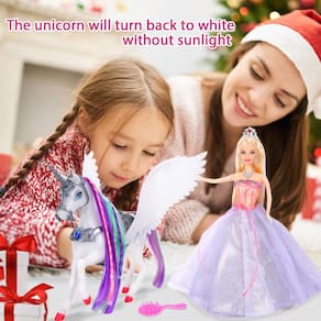 BRINQUEDOS DE UNICÓRNIO COM MUDANÇA DE COR: O unicórnio inteiro mudará de cor de BRANCO para ROSA sob o sol, o que traz mais diversão às atividades ao ar livre das crianças. - BRINQUEDOS DE UNICÓRNIO QUE MUDAM DE COR: O unicórnio inteiro mudará de cor de BRANCO para ROSA sob o sol, o que traz mais diversão às atividades ao ar livre das crianças - BONECA PRINCESA E UNICÓRNIO FUNCIONAL: a princesa usa um vestido elegante, o unicórnio muda de cor e a sela e as asas podem ser colocadas em um cavalo - DIMENSÕES: A boneca tem 11,5 polegadas e o unicórnio tem 9 x 9,8 polegadas - Diversão para modelar o cabelo: as crianças podem usar o incluído pente para modelar o cabelo loiro da princesa, bem como a crina e a cauda arco-íris do unicórnio - BRINQUEDOS DE UNICÓRNIO PARA MENINAS: este O playset adicionará magia às brincadeiras de seus filhos e trará muita alegria para as meninas, sejam elas pequenas ou grandes! Sua princesa vai brincar por dias
