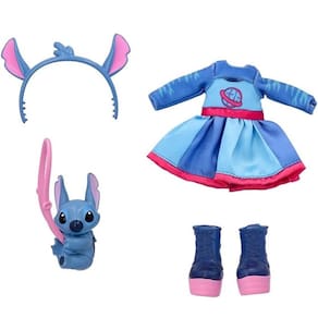 Encanto Disney: Inspirada no Stitch, com acessórios exclusivos como tiara com orelhas, bolsa temática e vestido brilhante.