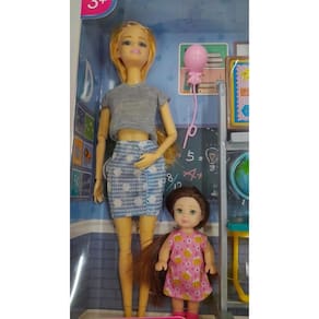1 boneca professora, 1 aluna, 1 balão, 1 lousa escolar, 1 mesa com carteira, entre outros acessórios.