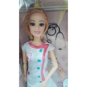 1 boneca veterinária com roupa e calçado, 1 coelho, 1 gato, 1 estetoscópio, 1 mesa de atendimento.