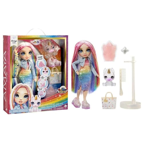 A boneca Amaya Raine veste um look vibrante com brilhos e cores do arco-íris, exibe longos cabelos coloridos e maquiagem cintilante que destaca seus olhos de vidro e cílios longos, ela trás acessórios personalizáveis, como sapatos e bolsas, que podem mudar de cor com um toque de slime. Acompanha um bichinho mágico que também muda de cor.