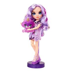 Violet Willow da Rainbow High vem vestida de roxo com muito brilho e estilo. Com cabelos longos e vibrantes, olhos de vidro e rosto iluminado, ela traz acessórios personalizáveis, como sapatos e bolsas personalizáveis, que podem mudar de cor com um toque de slime. Acompanha um bichinho mágico que também muda de cor.