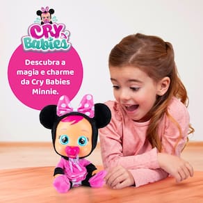 Essa boneca super fofa chora lagrimas de verdade e emite sons iguais ao de um bebe de verdade ! Basta tirar a chupeta da boca dela que ela chora cada vez mais e nao para ate ganha-la de volta. Brincar de boneca ira ficar muito mais divertido com a Cry Babies Minnie!