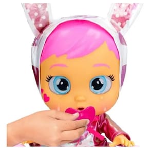 Dê a ela uma chupeta ou uma mamadeira para evitar que ela chore. Quando você tira a chupeta dela, ela chora lágrimas de verdade e seus olhos brilham como estrelas! Veja seus olhos brilharem como estrelas tão brilhantes quanto o céu noturno. Ela emite sons de choro!