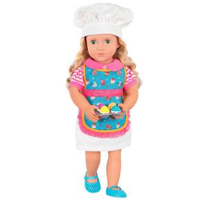 - Inclui: (1) boneca de 45,7 cm (1) saia jeans (1) blusa (1) par de sapatos (1) avental (2) luvas de forno (1) bolsa de chef (1) batedor (1) tigela de mistura (1) bandeja de cupcake (4) cupcakes (1) tubo de cobertura (1) caderno de esboço.