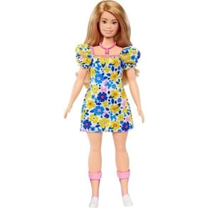 Boneca Barbie Fashionistas #208, boneca com síndrome de Down usando vestido floral, criada em parceria com a Sociedade Nacional da Síndrome de Down