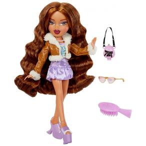 As Garotas Apaixonadas por Moda estão prontas para enfrentar o dia com estilo! De um gole de café a viagens de compras, elas estão saindo ao seu próprio ritmo com os looks mais descolados. Seja passeando pelas ruas da cidade ou arrasando na pista de dança, quando Cloe, Yasmin, Jade e Sasha saem, elas entram com suas super roupas estilosas. Yasmin veste um top corset floral sobre um vestido de tule lavanda. Por cima, ela usa uma jaqueta marrom de couro falso forrada com pele falsa. Seus sapatos são plataformas com detalhes de pérolas. Os acessórios certos podem elevar qualquer conjunto! Yasmin vem com um colar de pérolas, bolsa lavanda e óculos de sol combinando. Seu cabelo apresenta ondas volumosas, e o visual é complementado com um olho roxo e lábios vermelhos. A paixão fashion de Yasmin é misturar vintage clássico com peças modernas. Suas amigas a chamam de Princesa Encantada por seu estilo doce e nobre. Vista-se para impressionar! Yasmin adora garimpar em brechós e encontrar texturas incríveis para montar um visual único. Yasmin, sempre estilosa, está pronta para qualquer ocasião! Parte da coleção Bratz Goin Out!, ela traz um visual encantador que reflete sua personalidade marcante. Com Yasmin, a diversão e a moda estão garantidas! Embalagem Deslumbrante: Embalagem deslumbrante brilhando com estilo e personalidade. Apresenta letras metálicas e perguntas no estilo de revista respondidas por seus favoritos. Inclui: Boneca de moda Bratz com roupa, bolsa, óculos de sol e escova.