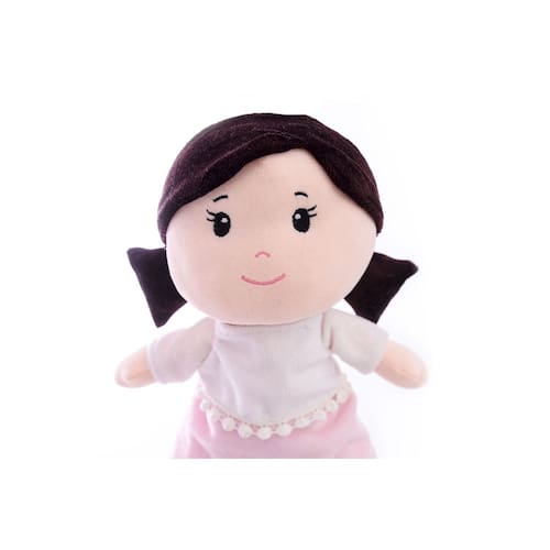 Conheça Zoe, a encantadora boneca de 34cm com cabelos Preto blusinha branca e saia rosa. Seu rosto bordado emana doçura e seu charme é irresistível. Perfeita para abraçar e amar, Zoe é uma adição adorável a qualquer coleção!
