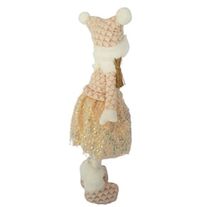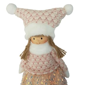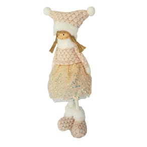 Menina em Pé com estrutura em tecido com enchimento de fibras e pernas de madeira forradas de feltro branco. Ela veste casaquinho, gorro e sapato de tricô branco com rosa, saia fitalolita com lantejoulas rose. A gola alta, a barra das pernas e do gorro com plumas brancas e os cabelos de sisal, são um charme a parte que deixa ela ainda mais fofa e charmosa. Bonequinha confeccionada com materiais PREMIUM e acabamento finíssimo, linda, perfeita!
