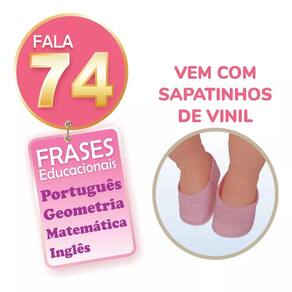 Características: - Boneca fala 74 frases educacionais português geometria matemática alfabeto e inglês - Tamanho aproximado da boneca de 56 cm - Composição: Silicone e Tecido - Abre e Fecha os olhinhos - Acompanha lindos sapatinhos - Marca: Adijomar - Recomendado para crianças maiores de 03 ano de idade - Código de Barras: 7897020203909
