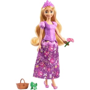A boneca Rapunzel apresenta dois visuais distintos - fazer um piquenique ou passar o dia fazendo arte - e inclui dois corpetes de encaixe fáceis de usar, duas saias macias e nove acessórios temáticos.