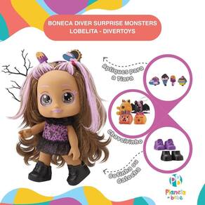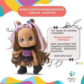 Boneca Diver Surprise Monsters Lobelita - Divertoys A Lobelita é uma das personagens encantadoras da linha Diver Surprise Monsters, que combina estilo fashion com um toque de mistério e diversão. Com aproximadamente 26 cm de altura, ela é feita de vinil macio, proporcionando um toque agradável e resistência para brincadeiras diárias. Seu visual único conta com cabelos bicolores em tons de rosa e marrom, com tiara decorada, olhos grandes e expressivos, e um vestido com saia de tule, criando um look inspirado em lobinhas modernas. Acessórios surpresa: A cada embalagem, você encontra três saquinhos misteriosos contendo diferentes acessórios, como: Par de sapatos estilizados Botinha ou Galocha , Apliques para colocar na tiara Picolé, Sorvete, Cupcake ou Nuvem e um Chaveiro que pode ser como bolsa para a boneca ou como acessório para a criança Morcego, Abóbora e Coruja . Cada bonequinha guarda mistérios encantadores e um toque de estilo assombroso com suas roupas e acessórios fashion A Lobelita é perfeita para quem busca uma boneca com estilo único e acessórios que tornam cada momento de brincadeira uma surpresa divertida. Principais Características: - Idade Recomendada: A Partir de 3 anos - Modelo: Lobelita - Acompanha 3 Saquinhos Surpresa - Cabelo Bicolor Estiloso - Olhos Brilhantes Expressivos - Tiara Estilizável com Apliques - Acompanha Par de Sapatos - Acompanha Chaveiro - Mistério e Diversão - Boneca em Vinil Macio com 26cm - Material Leve e Resistente - Aprovado pelo Inmetro Especificações Técnicas: - Conteúdo da Embalagem: 1 Boneca Diver Surprise Monsters Lobelita - Divertoys - Dimensões do Produto AxL : 26,5 x 13,0cm aprox. - Composição/Material: Plástico, Vinil - Peso do Produto: 0,750kgs - : 30 dias Contra Defeitos de Fabricação Pelo Fabricante - Certificação: Inmetro 002406/2022 - Código do Fabricante: 8304 - EAN: 7898639383044 - Marca: Divertoys Imagens Meramente Ilustrativas. As cores e estampas podem variar de acordo com o lote do fabricante. Marca: Não Informado