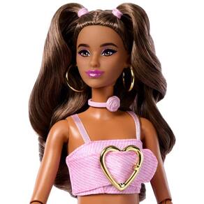 Boneca Barbie Deluxe Style #12 com cropped jeans rosa e calça flare com estampa de rosas combinando, cabelo castanho ondulado, acessórios como bolsa de mão em formato de rosa e joias.