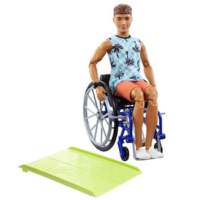 - O boneco Ken desperta potencial de jogo com uma cadeira de rodas manual azul royal e uma rampa verde que o ajudam a entrar e sair facilmente da Barbie Dreamhouse (vendida separadamente, sujeita à disponibilidade).