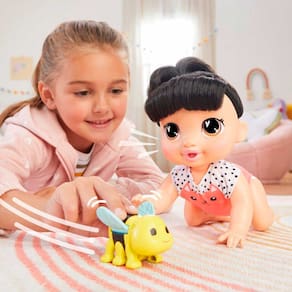 Boneca Interativa - Baby Alive - Engatinha e Brinca - Katie Kat - Hasbro: Katie Kat mal pode esperar para brincar. Uma boneca que engatinha de verdade. Basta apertar o botão nas suas costas para ver a boneca engatinhar e emitir sons adoráveis. Esta fofura é uma boneca com acessórios que também incluem uma escova para seu cabelo macio e estiloso. Detalhes: • Ela possui 27 cm e emite mais de 40 sons diferentes, incluindo música divertida. Esta boneca interativa reproduz muitos efeitos sonoros fofos, como ficar animada para engatinhar, comer e rir enquanto anda • Basta dar a mamadeira em sua boca para que a boneca emita sons de comidinha • Amiga abelha que voa: movimente a abelha de brinquedo pelo chão e observe suas asas batendo para cima e para baixo. É muito divertido contar histórias com os acessórios da boneca • Movimenta e dança: Pegue-a boneca no colo e pressione e segure o botão nas costas dela para iniciar uma melodia musical de 12 segundos e fazer seus braços e pernas balançarem como se ela estivesse dançando • Cabelo macio e estiloso: Esta boneca vem com uma escova para pentear os seus cabelos macios e fofos. Ela é uma boneca com cabelo que pode ser escovado e estilizado, além de um macacão removível Informações: • Produto: Boneca Baby Alive Morena Katie Kat Engatinha e Brinca • Marca: Hasbro • Coleção: Baby Alive • Linha: Baby Alive Engatinha e Brinca • Personagem: Katie Kat • Tipo: Boneca Bebê Interativa com Acessórios • Categoria: Bonecas e Cia • Tamanho: 27 cm (altura) • Conteúdo: - 01 Boneca Interativa - 01 macacão removível - 01 brinquedo de abelha rolante - 01 copo com canudinho - 01 escova de pentear cabelo • Recomendação: para crianças a partir de 03 anos de idade Especificações: • Modelo: Baby Alive Crawl ‘n Play Katie Kat • Referência: F9710 • Código de Barras: 5010996271969 • Embalagem (C x A x L): 31 x 35 x 14 cm • Embalagem (Peso): 0.983 kg • Funcionamento: Requer 04 pilhas AA (não incluídas) • Material / Composição: Plástico, Vinil e Tecido • Registro: IFBQ 08845-01/2021 • Certificado: Órgãos Autorizados - OCP´S (Organismos de Certificação de Produtos) Aviso: • As imagens são meramente ilustrativas • Os pesos, tamanhos e medidas são aproximados • As cores e estampas dos produtos podem ter variações • As informações são de responsabilidade do fabricante ou fornecedor