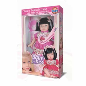 Boneca Interativa - Baby Kiss - Chora e Balbucia - Morena - Sid-Nyl: a Boneca Baby Kiss é uma gracinha e está pronta para ser cuidada e mimada. Quando apertam sua barriguinha, a Baby Kiss chora e balbucia como um bebê de verdade! Membros produzidos em vinil macio e corpinho em tecido com enchimento em de algodão. Tudo para o abraço ser mais gostoso. Ela vem com um vestidinho lindo e tem detalhes encantadores. INFORMAÇÕES: • Produto: Boneca Baby Kiss • Marca: Sid-Nyl • Tipo: Boneca Interativa • Categoria: Bonecas e Cia • Tamanho (C x A x L): 29 x 51 x 12 cm • Volume (Peso): 0.548 kg • Conteúdo: 1 boneca • Recomendação: para crianças a partir de 03 anos de idade ESPECIFICAÇÕES: • Referência: 910 • Código de Barras: 7897547709106 • Embalagem (C x A x L): 36 x 60 x 12 cm • Embalagem (Peso): 0.978 kg • Funcionamento: à bateria - 03 LR44 (inclusas) • Material / Composição: vinil, fibra e tecido • Registro: CE-BRI/IQB-167-NM-300/20002 • Certificado: Órgãos Autorizados - OCP´S (Organismos de Certificação de Produtos) BENEFÍCIOS DE BRINCAR: - Eleva a autoestima - Exercita a memória - Estimula o raciocínio - Exercita o imaginário - Desenvolve a criatividade - Desenvolve percepção visual - Desperta a atenção e curiosidade - Desenvolvimento neuropsicológico - Estimula habilidades motoras básicas - Incentiva a comunicação e linguagem - Desenvolve aspectos emocionais e afetivo - Estimula o reconhecimento de formas e cores AVISO: - As imagens são meramente ilustrativas - Os tamanhos e medidas são aproximados - As cores e estampas dos produtos podem ter variações - As informações são de responsabilidade do fabricante ou fornecedor