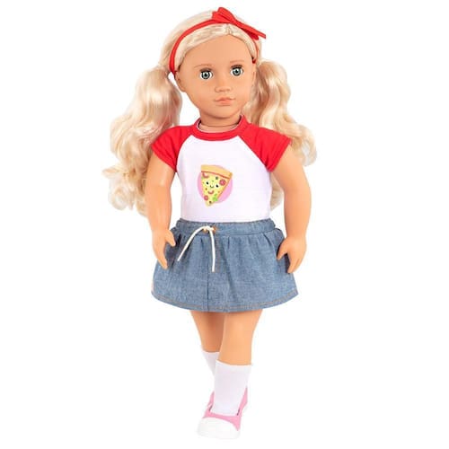 Our Generation - Boneca Jolene, tem 46 cm e ama pizza Ela tem olhos verdes brilhantes que abrem e fecham, e seu longo cabelo loiro ondulado é divertido de escovar e pentear Jolene adora se expressar através de roupas coloridas e designs divertidos. Ela está vestindo um top vermelho e branco com uma estampa de pizza com carinha feliz, uma saia estilo jeans, meias até o joelho e sapatos rosa e branco. Jolene também pode girar os braços e as pernas e você pode dar a ela penteados exclusivos com sua faixa vermelha brilhante para um toque de estilo pessoal Our Generation não se trata apenas de uma boneca, um lindo conjunto de roupas ou mesmo um kit de acessórios fantásticos. É sobre incentivar crianças de todos os estilos e gostos a criar suas próprias histórias, desenvolvendo um universo ilimitado de brincadeiras com bonecas e acessórios. Sua embalagem é feita de material reciclado, especialmente desenvolvida para uma geração mais ecológica que não aceitaria nada menos. Essa é a nossa história, e essa é a nossa turma