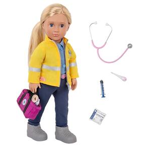 Salve o dia com Kaylin! Esta boneca paramédica de 46cm da nossa geração está sempre preparada para ajudar suas amigas em momentos de necessidade. Ela tem olhos azuis brilhantes que abrem e fecham, e seu longo cabelo loiro é divertido de pentear!