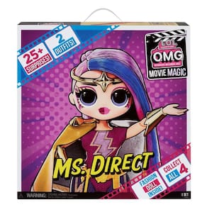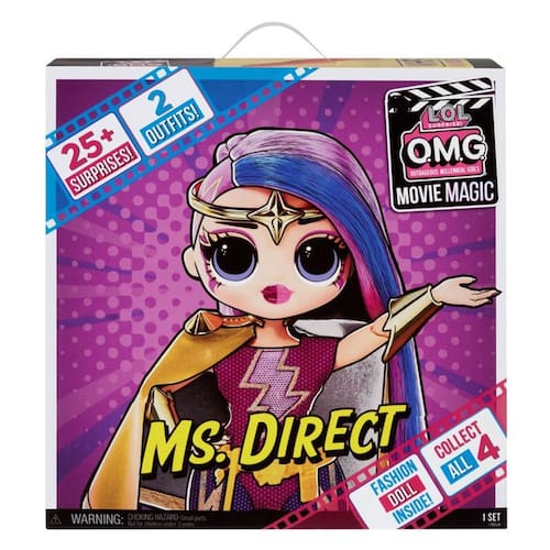 LOL Surprise! OMG Movie Doll é a séria inspirada no incrível mundo do cinema, proporcionando uma experiência de unboxing nunca vista antes! São 25 surpresas para descobrir. A Ms Direct representa o gênero Super-Herói. E acompanha 2 figurinos, óculos 3D, incríveis acessórios e a embalagem se transforma em um cenário de cinema e características que simbolizam o gênero de filme que ela representa. Há outros três modelos para conhecer, a Gamma Babe, Spirit Queen e Starlette.