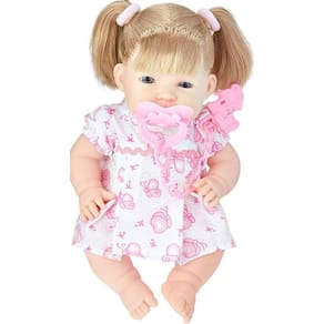 Vem com um adorável vestidinho e uma linda chupeta como acessório. Encante-se com a simplicidade e detalhes dessa boneca super fofa.