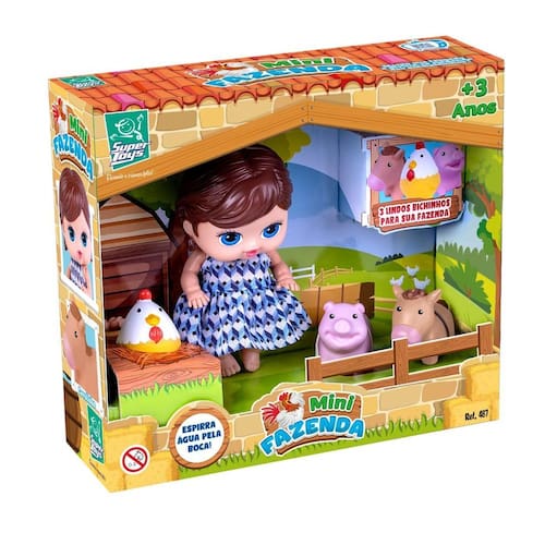 Boneca Mini Fazenda Com 3 Animais Galinha, Porco e Cavalo - Super Toys