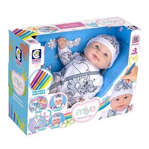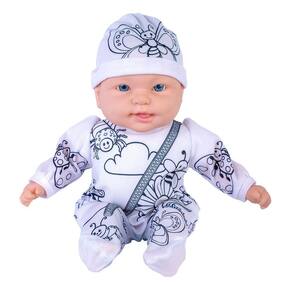 A boneca vem com o macacão e a touca prontos para colorir, oferecendo personalização ilimitada e única.