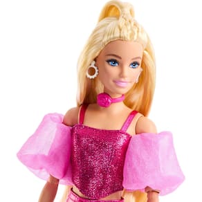 Barbie Boneca estilo deluxe nº 12,7 cm, roupa rosa metálico, cabelo loiro, espartilho brilhante e calça brilhante com acessórios como colar rosa e bolsa de mão