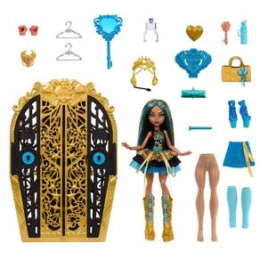 High com a boneca Skulltimate Secrets Modas Secretas Cleo Denile da Mattel! Essa boneca oferece uma experiência de unboxing única, onde as crianças podem se transformar em detetives assustadoras, usando uma chave de lupa "mágica" para procurar pistas no mapa e desvendar os segredos de Cleo Denile.