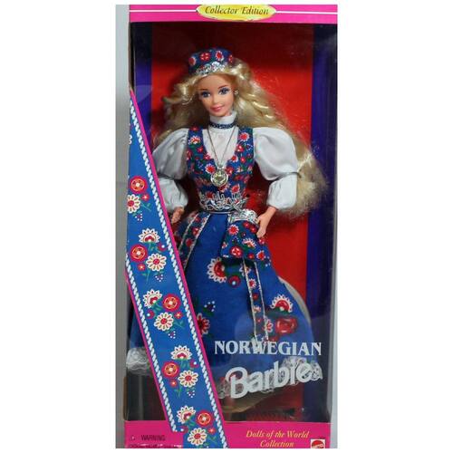 A Norwegian Barbie Dolls of the World Collection representa a cultura da Noruega com um traje folclórico bunad em azul e branco, composto por vestido com detalhes em renda sobre blusa branca de mangas bufantes com acabamento azul na gola. A boneca tem cabelos loiros em longas tranças e acompanha gorro quadrado combinando, bolsa estampada com fecho prateado e colar com moeda tradicional prateada, indicada principalmente para colecionadores e exposição em vitrines.