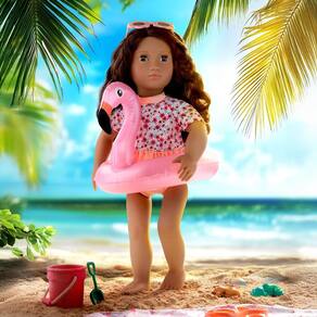 A boneca Our Generation Gabriela está pronta para viver grandes aventuras com muito estilo! Com 46 cm de altura, ela encanta com seus olhos castanho-escuros que abrem e fecham e cabelos ondulados que podem ser penteados de várias maneiras. Seu corpo é macio e abraçável, com braços e pernas articulados que permitem diversas poses durante a brincadeira. Gabriela acompanha dois looks completos: um maiô estampado para os momentos à beira-mar e um vestido de verão superfofo para passeios ao sol. Além disso, ela vem com acessórios como óculos de sol florais, calcinha, sandálias, toalha, boia inflável de flamingo, balde, pá, peneira, molde de areia e três conchinhas, que tornam a brincadeira ainda mais divertida. As roupas têm fechos práticos, ideais para as crianças explorarem sua criatividade e autonomia ao trocar os visuais da boneca. Compatível com a maioria das bonecas, roupas e acessórios de 46 cm.
