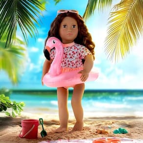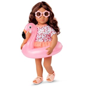 A boneca Our Generation Gabriela está pronta para viver grandes aventuras com muito estilo! Com 46 cm de altura, ela encanta com seus olhos castanho-escuros que abrem e fecham e cabelos ondulados que podem ser penteados de várias maneiras. Seu corpo é macio e abraçável, com braços e pernas articulados que permitem diversas poses durante a brincadeira. Gabriela acompanha dois looks completos: um maiô estampado para os momentos à beira-mar e um vestido de verão superfofo para passeios ao sol. Além disso, ela vem com acessórios como óculos de sol florais, calcinha, sandálias, toalha, boia inflável de flamingo, balde, pá, peneira, molde de areia e três conchinhas, que tornam a brincadeira ainda mais divertida. As roupas têm fechos práticos, ideais para as crianças explorarem sua criatividade e autonomia ao trocar os visuais da boneca. Compatível com a maioria das bonecas, roupas e acessórios de 46 cm.