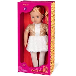 A Hope está sempre pronta para comemorar com os amigos e família! Ela é cheia de brilho e amor. Vem vestida com a sua melhor roupa de festa, pronta para celebrar. Ela veste um lindo vestido branco com uma saia de pele sintética. Usa um casaco de lantejoulas douradas e completa seu look com meia-calça branca e sapatos sociais com detalhes em dourado. Hope é uma linda boneca com longos cabelos loiro-avermelhados e olhos cinza únicos. Seu pescoço, ombros e quadris giram para que ela possa se mover de muitas maneiras diferentes! Hope está pronta para fazer uma nova amiga! Our Generation não se trata apenas de uma boneca, um lindo conjunto de roupas ou mesmo um kit de acessórios fantásticos. É sobre incentivar crianças de todos os estilos e gostos a criar suas próprias histórias, desenvolvendo um universo ilimitado de brincadeiras com bonecas e acessórios. Sua embalagem é feita de material reciclado, especialmente desenvolvida para uma geração mais ecológica que não aceitaria nada menos. Essa é a nossa história, e essa é a nossa turma! Inclui: boneca, bolerinho dourado, vestido branco, meia-calça, sapatos.