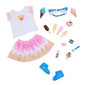 Para explorar doces aventuras e muito estilo com a Boneca Our Generation Lorelei! Esta boneca tem olhos verdes brilhantes que abrem e fecham e longos cabelos loiros que são divertidos de pentear! Ela pode girar o pescoço, os braços e as pernas para trocar de roupa com facilidade e também pode dobrar os joelhos e cotovelos na hora de servir deliciosas guloseimas com seus 10 acessórios para sorveteria! Ela chega vestindo um top super fofo com estampa de sorvete com babados nas mangas, uma saia combinando, um lindo laço no cabelo com estampa de cobertura de sorvete e um par de sapatos azuis.