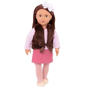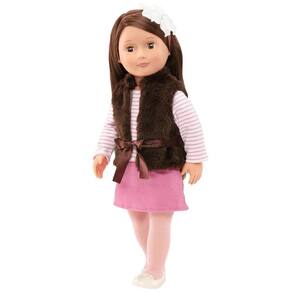Sienna está pronta para embarcar em um dia muito divertido Ela ama moda, principalmente o seu coletinho fofo em pele sintetica. Adora ir ao shopping com a sua mãe e amigos para ver qual é a próxima grande tendência e o que é elegante Seu cabelo é sedoso, macio e fácil de pentear. Ela tem cabelos castanhos compridos e lisos e lindos olhos castanhos. Vestida com uma camiseta listrada, colete quentinho, saia de veludo rosa, meia calça e sapatos. Suas roupas tem fechos fáceis de abrir o que as tornam rápidas e fáceis de colocar e remover.